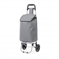 Carro de compra plegable línea Nature, fabricado en poliéster 600D RPET resistente a partir de plástico reciclado, promoviendo la reutilización de residuos plásticos y la sostenibilidad. Cuenta con asa reforzada, cuerpo metálico tubular, bolsillo posterior con cremallera, soportes con gomas de protección y ruedas reforzadas de alta calidad, con etiqueta distintiva RPET en la solapa.