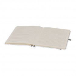 Bloc de notas con tapas rígidas blancas fabricadas en Cartón Reciclado. Interior con 80 hojas a disposición de una raya. Incluye marcapáginas, en mismo color que cinta elástica de cierre y portabolígrafos. Especial para grabado láser mostrando el color seleccionado.