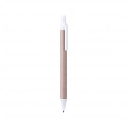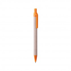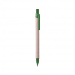 Bolígrafo de línea nature con mecanismo pulsador, fabricado en cuerpo de cartón reciclado color natural y accesorios en PLA (Ácido PoliLáctico), un material 100% natural obtenido de almidón de maíz, yuca o caña de azúcar, completamente compostable al final de su vida útil.