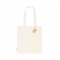 Bolsa en 100 % algodón orgánico de 180 g/m², en tono natural, con acabado cosido y asas medianas reforzadas de 70 cm. Resistente hasta 8 kg, con etiqueta de algodón orgánico e hangtag en cartón reciclado.