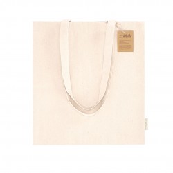 Bolsa confeccionada principalmente en algodón reciclado de 240 g/m2. Asas largas de 70cm con refuerzo, de acabado cosido. Logotipo en etiqueta lateral y resistencia hasta 7 kg de peso.