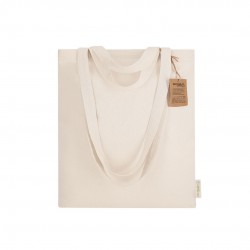 Bolsa con fuelle confeccionado principalmente en algodón reciclado de 140g/m2. Cuenta con doble asa: asas largas de 70 x 2,5 cm y asas cortas de 30 x 2,5 cm. Incluye distintivo de Algodón Reciclado. Resistencia hasta 6 kg de peso.
