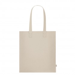 Bolsa fabricada en fieltro RPET reciclado. Con asas reforzadas largas. Resistencia hasta 6kg. Incluye distintivo RPET en etiqueta exterior.El material RPET se elabora a partir de plástico reciclado, para así fomentar la reutilización de residuos plásticos y ayudar a la sostenibilidad del planeta.