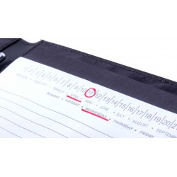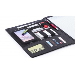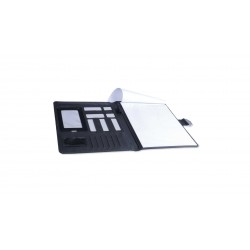 Bloc 20 Hojas Carpeta tecnológica en elegante combinación de poliéster y suave polipiel. con original cierre metálico. Interior con compartimentos para memoria USB, powerbank, compartimento táctil para smartphone, tarjeteros y soporte para bolígrafo. Con bloc de notas extraíble de 20 hojas a una raya y presentada en elegante caja negra.