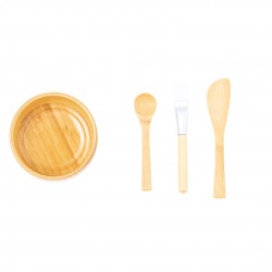 Completo set de mascarilla fabricado en bambú, ideal para una correcta aplicación de la mascarilla facial . Compuesto por 4 piezas: cuenco de elegante diseño, cuchara, paleta y brocha de suaves cerdas. Fácil de limpiar y presentado individualmente en caja de diseño kraft.