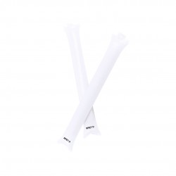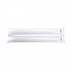 Par de bastom sticks/aplaudidores en RPET, fabricados en material resistente y ruidoso de color blanco. Reutilizables y con válvula de inflado incluida. Confeccionados en RPET a partir de plástico reciclado, promoviendo la reutilización de residuos plásticos y la sostenibilidad. Presentados en bolsa de papel reciclada.