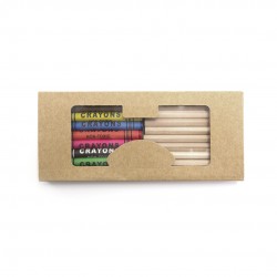 19 Piezas Set de 19 piezas en estuche con cuerpo en cartón natural con ventana y bandeja interior. Contiene ceras de cuerpo cilíndrico y lápices de madera natural de cuerpo hexagonal en variados colores.