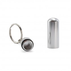 Pastillero llavero de un compartimento con diseño discreto y elegante, fabricado en aluminio de acabado brillante.
