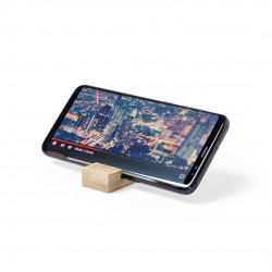 Llavero soporte para smartphone de línea nature, fabricado en bambú resistente con acabado lacado, e incorpora cordón resistente y anilla metálica.