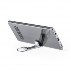 Llavero soporte para smartphone y tablet en aluminio de acabado mate, especialmente diseñado para marcaje láser. Presentado de forma individual en bolsita autocierre.