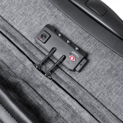 Trolley línea Nature Fabricado en resistente 300D RPET, con compartimento principal con cierre de cremallera de doble tirador conforme a estándares TSA, que permite la inspección aduanera sin forzar el cierre, usando llave especial disponible para autoridades.