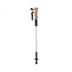 Bastón deportivo plegable y telescópico Fabricado en resistente aluminio, con mango ergonómico en corcho natural, accesorio de espuma para descansar las manos, mecanismo de amortiguación antishock, refuerzo antideslizante en el extremo de contacto con el suelo, cinta de seguridad ajustable, altura regulable e incluye accesorio para nieve, presentado en funda de transporte en color natural con cinta para hombro y cierre en negro. Ideal para senderismo, trekking o actividades al aire libre, ofreciendo comodidad, seguridad y transporte fácil.