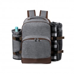 Mochila nevera para picnic línea Nature de 4 servicios (32 piezas) Fabricada en resistente 600D RPET con acabado gris y detalles en marrón, asa de transporte y cintas para hombros acolchadas y ajustables, compartimento principal con cremallera y tiradores metálicos, interior isotermo en PEVA y etiqueta exterior con distintivo RPET, un material elaborado a partir de plástico reciclado que fomenta la reutilización de residuos y contribuye a la sostenibilidad del planeta.