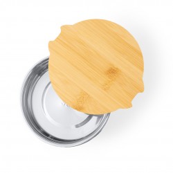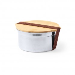 Fiambrera de 800 ml en acero inoxidable con tapa de bambú Fabricada en acero inoxidable, con capacidad de 800 ml, tapa hermética en bambú y cinta elástica de cierre, presentada en caja individual de diseño. Perfecta para transportar alimentos de forma segura y práctica, ideal para uso diario, oficina o actividades al aire libre.
