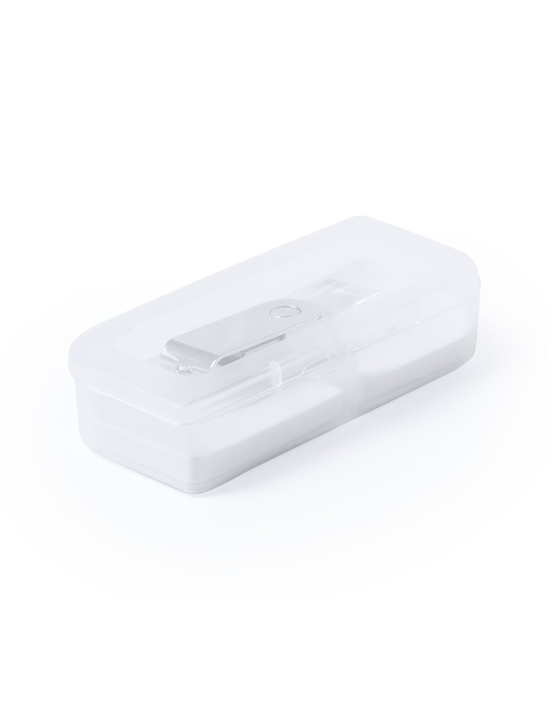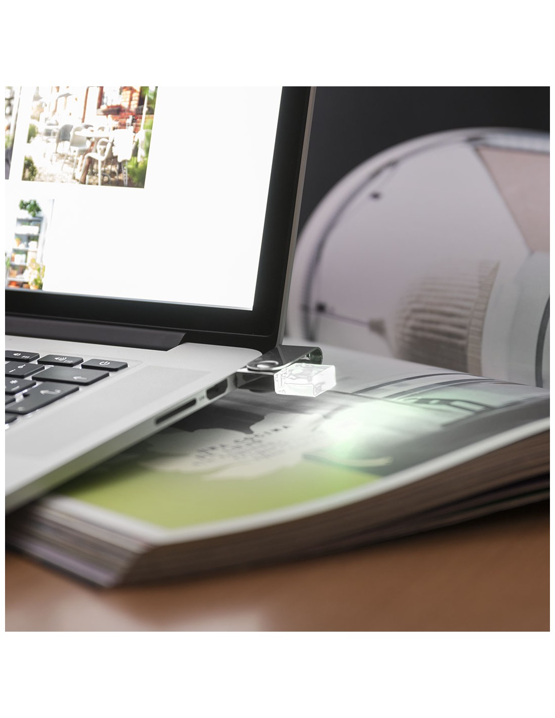 Memoria USB de 16GB de capacidad, con mecanismo giratorio. Con clip metálico de acabado brillante y cuerpo en combinación de metal y material acrílico transparente que se ilumina con luz blanca al conectarla al puerto USB. Presentada en estuche individual de PVC con interior en troquelado en suave espuma.