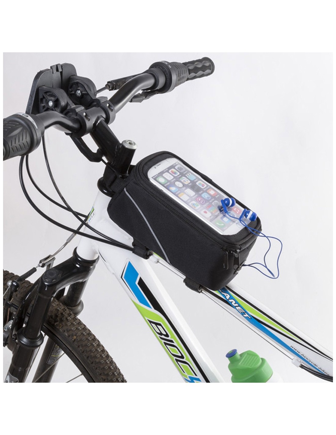 Práctica bolsa multiusos para la bicicleta. Incorpora un compartimento para el smartphone y frontal de pvc con función táctil. Está fabricado en poliéster 600D y cuenta con cremallera de cierre e interior acolchado. Para acoplarlo al manillar y a la barra de la bicicleta dispone de triple cierre de velcro.